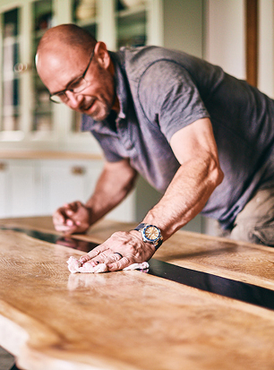 Jon sources or finds unique pieces of timber by word of mouth, through landowners felling trees, or trees that have fallen in strong winds. In the workshop he makes beautiful wooden serving boards, chopping boards, small tables and other customer-requested pieces from large rough sawn planks of oak, not all straight and precise, but miss shaped, which give the product a bespoke and beautiful finish. The current stack of oak pieces had been supplied by a farmer from a fallen oak tree on his land and who had asked John to produce some special individual pieces for his home.